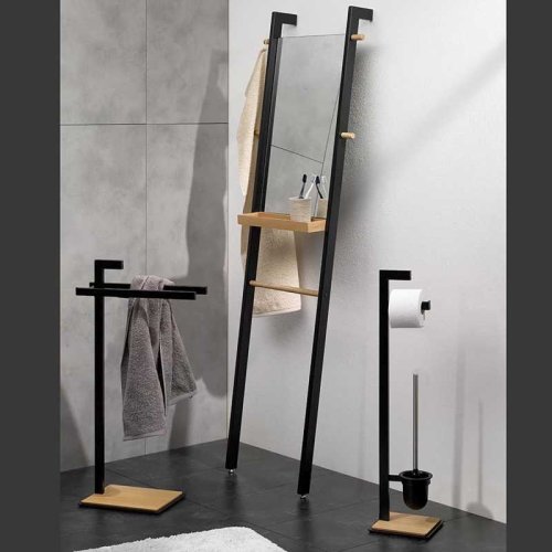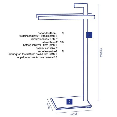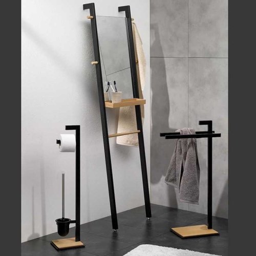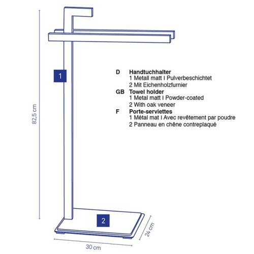 Štýlový a moderný vzhľad: dubový vešiak na uteráky vyrobený z kovu. Stojaci model získava svoj osobitý vzhľad kombináciou čierneho povrchu, plochých tvarov a svetlo hnedej dubovej drevenej dyhy na základnej doske. Držiak uteráka má 2 neotočné držiaky na uteráky. Základná doska držiaka na uterák má rozmery 30 x 24 cm s celkovou výškou 82,5 cm. Kov čierny matný s dubovou drevenou dyhou 30x24cm 82,5cm v