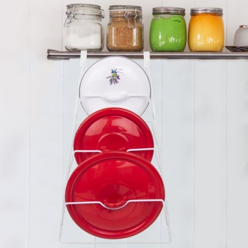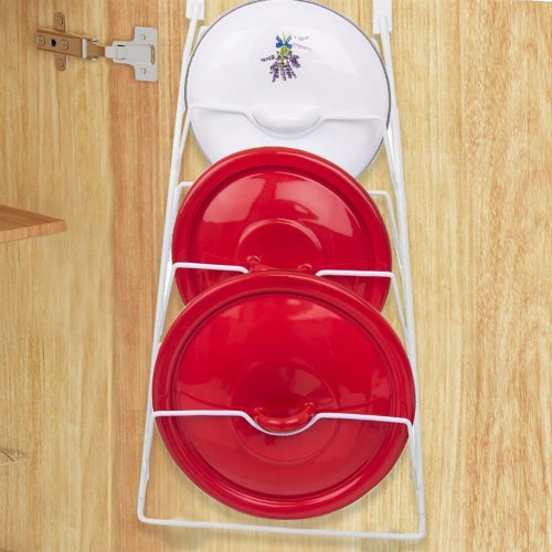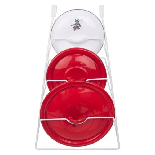 Stojan na pokrievky uloží do kuchynskej skrinky prehľadne až 6 pokrievok rôznej veľkosti (cca od veľkosti 14 cm do cca 28 cm). Nemusíte ho zložito pripevňovať, stačí ho zavesiť na dvierka skrinky. Materiál drôt s povrchovou plastovou úpravou. Rozmery š. 27.5 cm, v. 47 cm, na max. hr. dvierok 2.5 cm. EAN 8592381162559