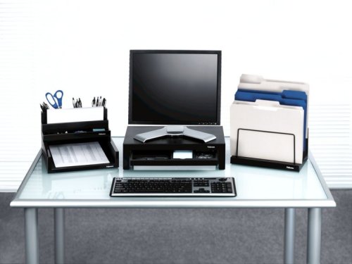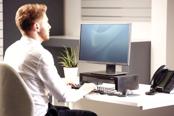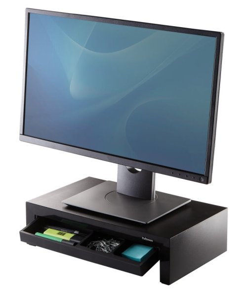 Praktický stojan pre monitor dvíha obrazovku na úroveň očí, čím zmierňuje svalové napätie ramien a šije. Umožňuje reguláciu výšky od 11 do 15 cm . Vďaka svojmu praktickému designu ušetrí miesto na vašom pracovnom stole. Propisovacie ceruzky, obálky a ďalšie dokumenty je možné uložiť do šuplíka v prednej časti . Klávesnicu či notebook je možné potom schovať priamo pod samotný stojan. V kľude si tiež môžete odložiť kávu, protišmykové gumové nožičky sa postarajú o perfektnú stabilitu.