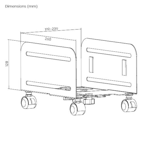 Hlavné vlastnosti: • Nastaviteľná šírka: Kompatibilný so širokou škálou zariadení (119–209 mm). • Pevné kolieska s blokovacím mechanizmom: Umožňujú ľahký pohyb a zároveň bezpečné zaistenie. • Odolná oceľová konštrukcia: Zaisťuje dlhú životnosť a nosnosť až 10 kg. • Praktická inštalácia: Možno ľahko umiestniť pod alebo vedľa stola pre úsporu miesta.