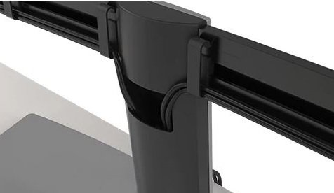 Elegantná pracovná stanica bez neporiadku Starostlivo navrhnutý stojan má výbavu pre kabeláž, vďaka ktorej je možné káble elegantne skryť. Usporiadajte káble a pretiahnite ich cez kruhový slot pre kabeláž v stojane. Káblové úchytky pozdĺž zakrivenej tyče umožňujú elegantne skryť všetky káble.
