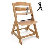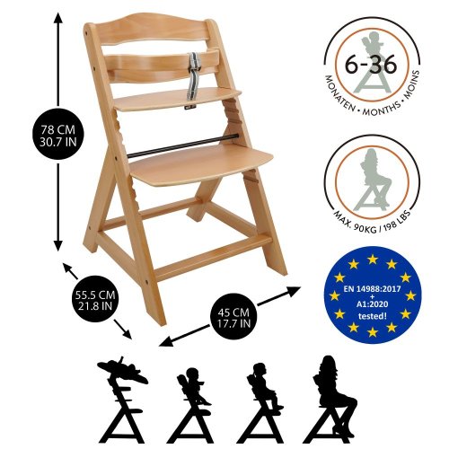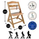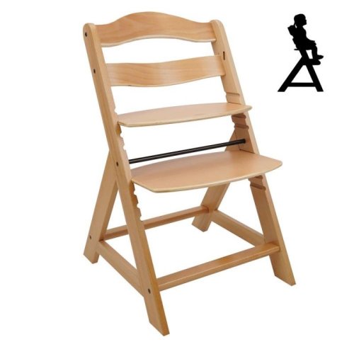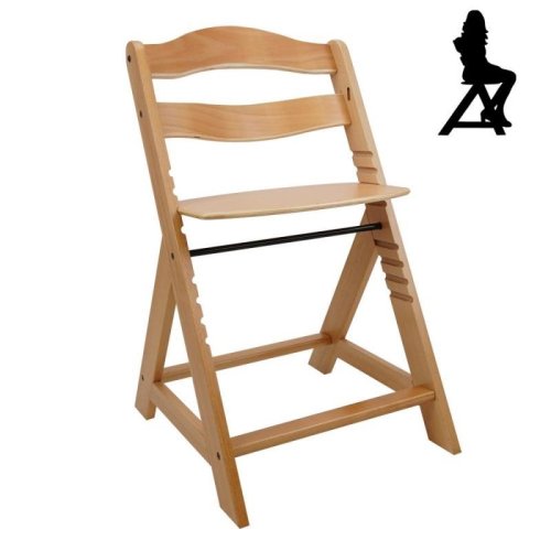 Drevená vysoká stolička, ktorá rastie spolu s dieťaťom. Vrátane prednej tyče a rozdelenia rozkroku – u starších detí je možné sňať a prerobiť na normálnej stoličke aj pre dospelých. Viacstupňové nastavenie výšky sedadla aj opierky nôh. Opierku nôh je možné úplne demontovať. Ideálne na kŕmenie, hranie a prvé domáce úlohy pri písacom stole. Odporúčaný vek: pre deti od 6 mesiacov. Maximálna nosnosť 90 kg. Produkt vyhovuje norme EN14988. Vyrobené z kvalitného nemeckého bukového dreva.