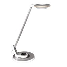 Moderná stmievateľná stolná LED lampa s integrovaným DC5V/1A USB portom na dobíjanie Vášho telefónu Na okrúhlej základni lampy s imitáciou brúseného hliníka je umiestnený dotykový panel s tlačidlami aj na stmievanie.