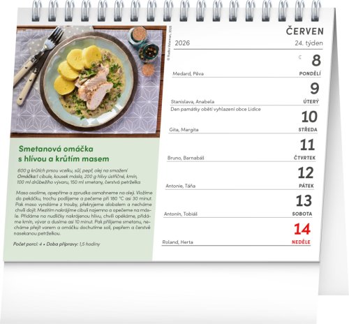 V kalendári nájdete 53 starostlivo vybraných receptov z tradičnej českej kuchyne. Týždenné kalendárium s priestorom na poznámky obsahuje aj sviatky, pamätné dni, mesačné fázy a prehľad na celý rok.