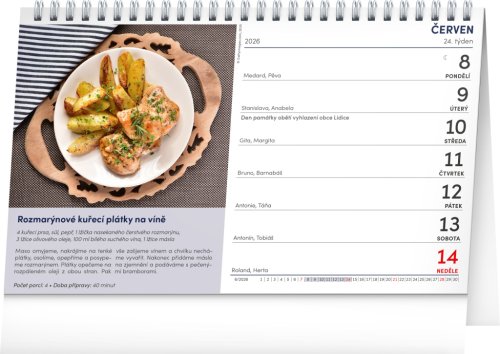 Pre všetkých, ktorí hľadajú inšpiráciu pri vymýšľaní nových jedál, je tu stolný kalendár nabitý tými najzaujímavejšími receptami. Nájdete tu 53 receptov, ktorých základom je poctivá domáca kuchyňa, ktorú vyznávali už naše babičky. Týždenný stolný kalendár s českými menami obsahuje aj sviatky, pamätné dni, mesačné fázy a prehľad na celý rok 2026 a 2027.