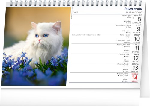 Oslávte sviatok spolu so svojim mačacím parťákom - v tomto praktickom stolnom kalendári nájdete mená mačiek na každý deň. V kalendári nájdete pekné fotografie a priestor na poznámky. Kalendár obsahuje týždenné české i slovenské kalendárium aj so sviatkami a pamätnými dňami, mená mačiek a mesačné fázy.