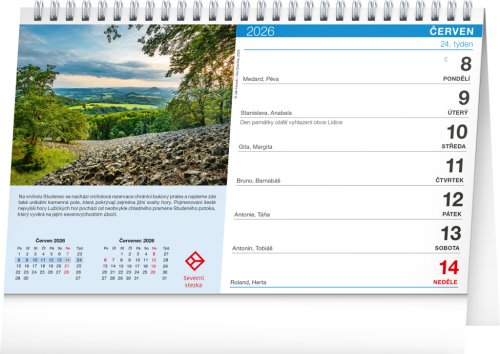 Trasy chodníkov Via Czechia (Severná, Južná, Stredozemie, Centrálna, Sliezsko a Českomoravská) prechádzajú celou Českou republikou po hraniciach i stredozemím, sledujú prevažne štátne hranice a prekračujú najvyššie vrcholy väčšiny našich hôr. Chodníky vedú v čo najväčšej miere prírodou a smerujú k mnohým zaujímavostiam jednotlivých oblastí. Texty aj fotografie dodal Ján Hocek. Stolný kalendár obsahuje okrem fotografií a textov slovenské kalendárium s menami, sviatkami a pamätnými dňami.
