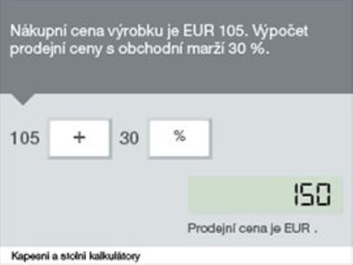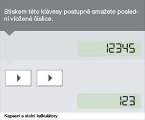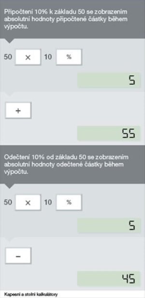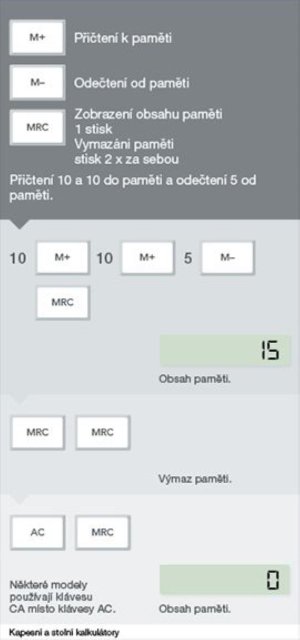 • Základné funkcie; percentá; odmocnina; zmena znamienka +/–, 3 klávesy pre prácu s pamäťou
