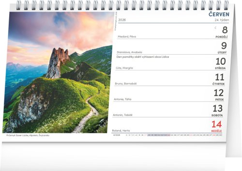 Stolový kalendár s fotografiami hôr a pohorí z celého sveta. Prezrite si zblízka hory od Washingtonu v USA cez Európu až po Čínu. Farebné fotografie dopĺňa české týždenné kalendárium s menami, sviatkami a pamätnými dňami, fázami mesiaca, rozšírený zoznam mien a prehľad na rok 2026 a 2027.