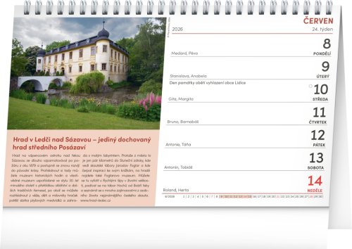 Vydajte sa na výlet po kúzelných hradoch a zámkoch Čiech, Moravy i Sliezska s naším stolným kalendárom s farebnými fotografiami P. Hrona. Súčasťou kalendára je aj slovenské týždenné kalendárium s priestorom pre vaše poznámky.