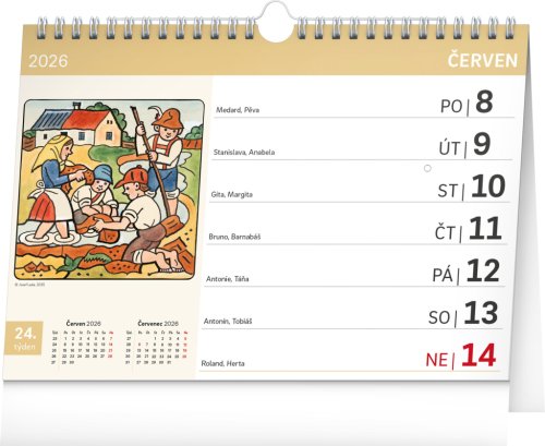 Okrem ilustrácií od Jozefa Lady sa kalendár vyznačuje extra veľkým písmom. Vďaka háčiku ho môžete zavesiť na stenu alebo ponechať na stole. Obsahuje slovenské kalendárium s menami, sviatkami a pamätnými dňami, mesačný prehľad a dostatok priestoru na poznámky.