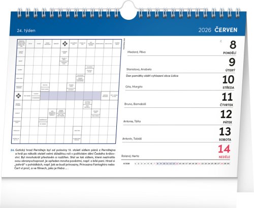 Stolový kalendár s krížovkami na každý týždeň. Vďaka háčiku ho môžete zavesiť na stenu alebo ponechať na stole. Obsahuje slovenské kalendárium s menami, sviatkami a pamätnými dňami, mesačný prehľad a dostatok priestoru na poznámky.