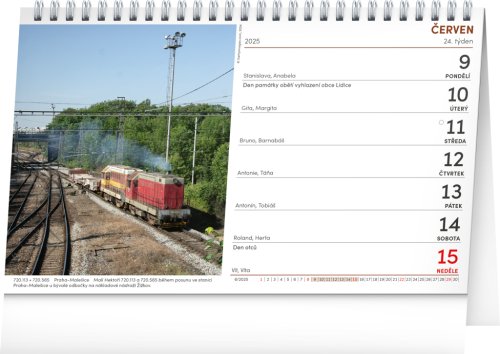 Jazdíte radi vlakom, máte svoju zbierku vláčikov, alebo ste aspoň obdivovateľmi ich krásy? Možno vám však chýba stolný kalendár s fotografiami vlakov a železnice. České týždenné kalendárium s priestorom pre vaše poznámky obsahuje mená, sviatky a ďalšie významné dni.