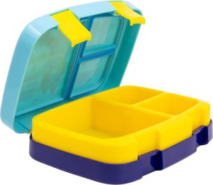 praktická krabička so 4 priehradkami rozdelenými do 2 úrovní, 3 priehradky hore a 1 priehradka (podnos) dole, vyrobená z odolného materiálu - vydrží pády a nárazy pri každodennom používaní, bez BPA.