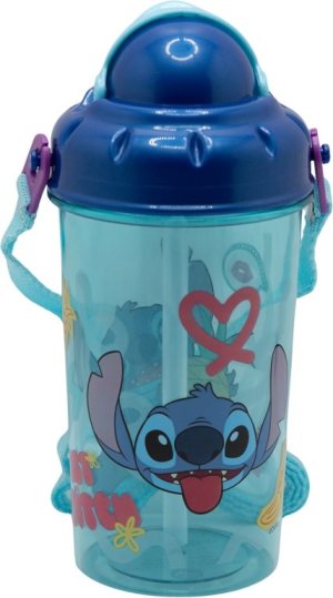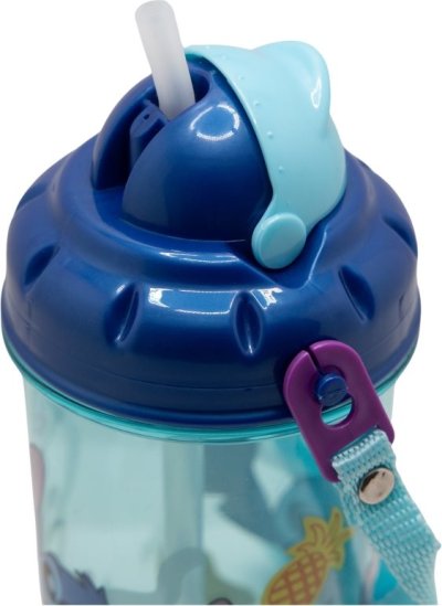 Detská plastová fľaša so slamkou, viečkom a popruhom, 465 ml, s motívom Stitche. Praktická plastová fľaša so slamkou, viečkom a popruhom. Ozdobená postavičkami z najobľúbenejších detských filmov a televíznych relácií.