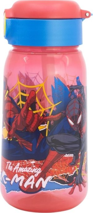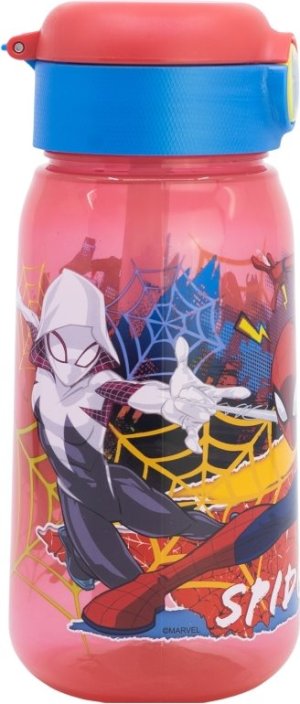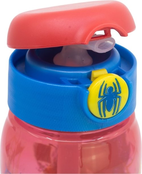 Detská plastová fľaša na vodu, 510 ml, s viečkom a slamkou, s motívom Spidermana. Opakovane použiteľná plastová fľaša na vodu, zdobená designmi na motívy obľúbených licencií. Má praktickú slamku pre ľahké pitie a viečko s tlačidlom, ktoré zabráni nechcenému rozliatiu a postriekaniu.