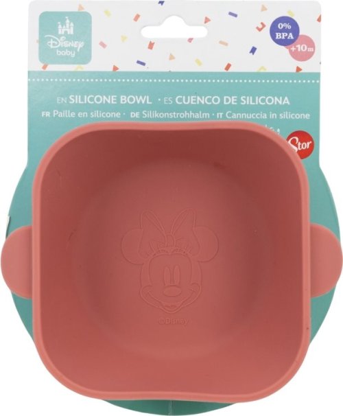 Štvorcová miska s motívom Minnie s prísavkou na prichytenie na stôl je ideálnou voľbou pre prvé pokusy o kŕmenie.