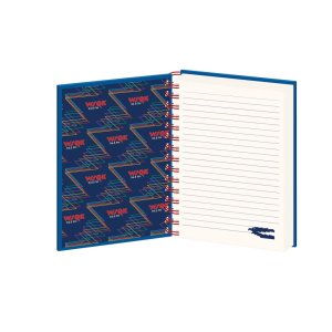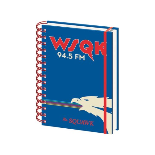 Stranger Things blok krúžkový - WSQK DPL10 je praktický poznámkový blok, ktorý zaujme všetkých fanúšikov populárneho seriálu Stranger Things. Jeho pevná obálka je ladená do tmavo modrej farby a zdobí ju výrazné červené logo WSQK 94.5 FM, čo je odkaz na ikonickú rozhlasovú stanicu zo seriálu. Na prednej strane je tiež štylizovaný motív orla, ktorý z obálky vystreľuje farebné linky, čo dodáva bloku dynamický a atraktívny vzhľad. Červená kovová špirála pevne drží stránky pohromade a zároveň umožňuje ľahké otáčanie listov.
