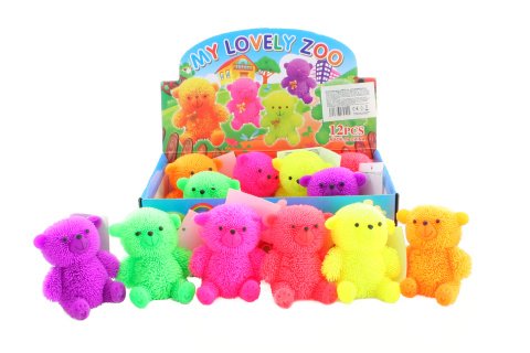 Gumový strapatý medvedík. Vnútri svietiaca gulička, ktorá bliká. Rozmery cca 9 x 8 x 5,5 cm. Vek 3+