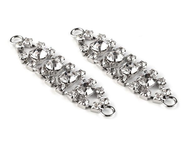 Noblesnú štrasovú ozdobu dopĺňajú trblietavé brúsené kamienky. Prispôsobí sa akémukoľvek tvaru. Vďaka dvom očkám po stranách ju môžete našiť na odevy a doplnky (rukavice, klobúky, látkové čelenky do vlasov a pod.). [Dá sa použiť na ramienka, vynikne aj na obuvi.] Ozdoba je vyrobená z nemagnetického kovu, magnetické sú iba očká po stranách. Variant č. 2 má rozmery 12 x 55 mm.