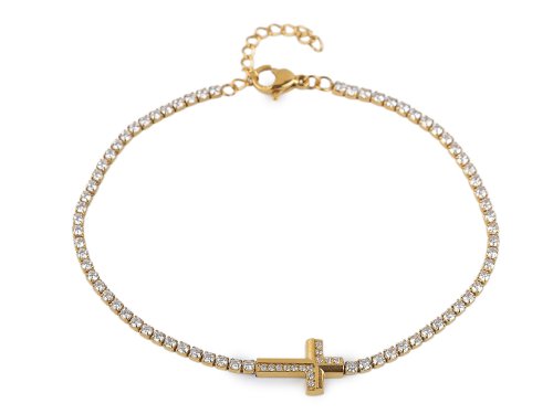 Náramok z nerezovej ocele upúta pozornosť brúsenými kamienkami po celej dĺžke a krížikom. Vďaka zapínaniu na karabínku a adjustačnej retiazke je náramok ľahko nastaviteľný a dokonale sa prispôsobí vášmu zápästiu. Rozmery krížika sú 10 x 15 mm.