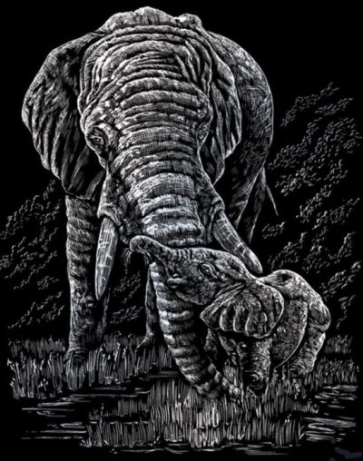 Strieborný škrabací obrázok Slonica s mláďaťom