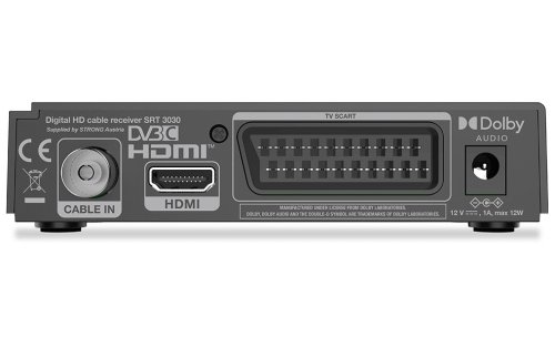 Strong SRT 3030 umožňuje príjem digitálnych nekódovaných programov TV a rádia v norme DVB-C . Podporuje rozlíšenie Full HD . Na prednom paneli sa nachádza USB port pre záznam televíznych programov, prehrávanie multimediálnych súborov a aktualizáciu softvéru. Okrem toho je tento prijímač vybavený elektronickým sprievodcom programami EPG , ktorý zobrazuje programové informácie až na 7 dní dopredu a ponúka tak pohodlné nastavenie až 8 časovačov . O skvelú kvalitu zvuku sa postará technológia Dolby Digital Plus . Súčasťou balenia je diaľkový ovládač (vrátane batérií) a napájací adaptér.