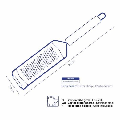 Špeciálne strúhadlo na kôru citrusových plodov: strúhadlo na hrubú kôru Rondo je ideálny na strúhanie jemných prúžkov kôry z citrónov, limetiek alebo pomarančov, tzv. kôry. Úzky tvar uľahčuje cielené zotieranie škrupín. Hrubé nerezové strúhadlo na kôru je 6,5 cm široké a 32 cm dlhé. Hrubý 4mm, nerez, 32x6, 5cm