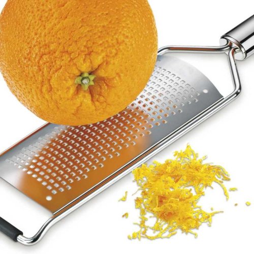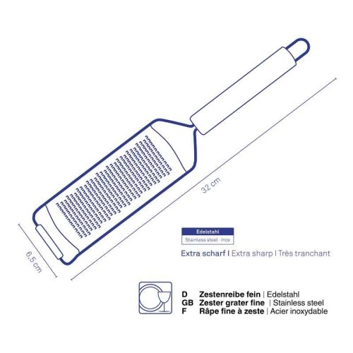 Profesionálne strúhadlo na kôru citrusových plodov: jemné strúhadlo Rondo na strúhanie jemných prúžkov z kôry citrónov, limetiek alebo pomarančov, tzv. kôry. Kompaktný tvar s konkávnym strúhacím povrchom uľahčuje cielené strúhanie škrupín. Nerezové strúhadlo na kôru s jemným strúhacím povrchom je 6,5 cm široké a 32,5 cm dlhé. Jemné 2mm, nerez, 32x6, 5cm