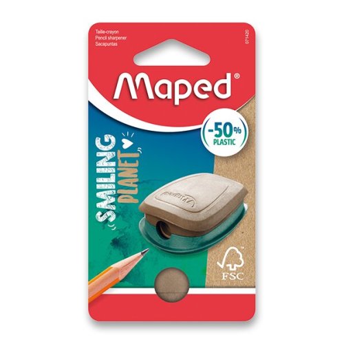 Plastové strúhadlo Maped Smiling Planet s odpadovou nádobkou. Je vyrobené z 50% zmesi drevného vlákna s certifikáciou FSC a má recyklovateľný kartónový obal.