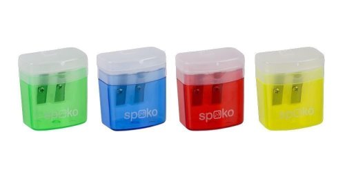 Dvojité školské strúhadlo s praktickým vekom a kontajnerom, vo farebnom mixe. Celkový rozmer: 35 x 20 x 40 mm. Balenie: 24 ks/displej.