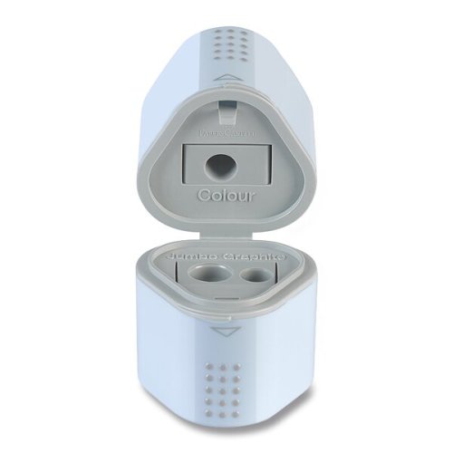 trojité strúhadlo vhodné pre štandardné trojhranné ceruzky i pastelky a silné typu Jumbo, * uzatvárateľné, * veľká nádobka na odrezky na oboch stranách
