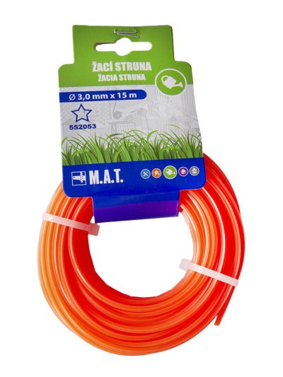Kvalitná žacia struna do všetkých druhov vyžínačov. Materiál polyamid s prísadami na zaistenie pevnosti a pružnosti. Profil šesťcípa hviezda. Priemer 3 mm a dĺžka návinu 15 m. EAN 8590804020431