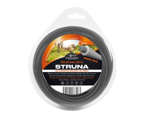 Žacia struna PROFI DUO je určená pre strunové kosačky a krovinorezy. Najmä pre prácu v náročnejších podmienkach. Struna sa skladá z 30 percent z tuhého karbónového jadra a zo 70 % z pružnejšieho vonkajšieho plášťa. Kombinácia týchto dvoch prvkov zaručuje väčšiu tvrdosť, ale aj pružnosť struny a výrazne prispieva k väčšej trvanlivosti strún a jej menšej spotrebe. Jednoduchá inštalácia do sekacej hlavice. Farba: šedá. Profil: kruh. Priemer: 2,4 mm. Dĺžka: 20 m.