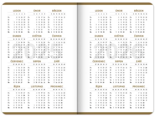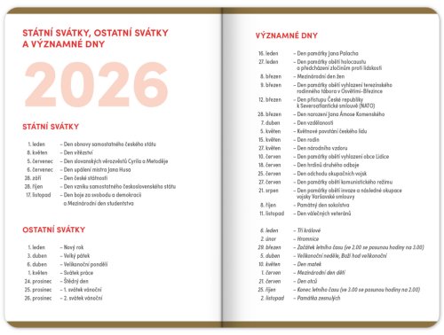 Študentský diár v minimalistickom čiernom dizajne obsahuje prehľad na rok 2025 a 2026, české týždenné riadkové kalendárium s menami a sviatkami, rozvrh hodín, priestor na poznámky a základné poznatky z matematiky, fyziky, chémie a angličtiny pre študentov. Kalendárium začína v septembri 2025 a končí v decembri 2026.