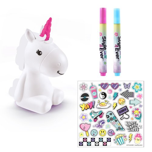Prineste do svojej izby mágiu so Svietiacim Jednorožcom Style4Ever, ktorého si deti samy ozdobia! Táto kreatívna súprava je ideálna pre všetkých malých umelcov, ktorí sa radi zapájajú do tvorenia a zároveň milujú kúzelné dekorácie. Svietiaci jednorožec, ktorého si môžete ozdobiť podľa vlastných predstáv, prináša nielen zábavu, ale aj krásne svetlo, ktoré vytvorí útulnú atmosféru. Balenie obsahuje: svietiaca figúrka jednorožca v krásnom dizajne, ktorý po dokončení projektu rozžiari vašu izbu. Svieti 8 farbami. Ďalej 4 fixy – na maľovanie a dozdobenie jednorožca v rôznych farbách. Nálepky - pre ešte väčšie kreatívne možnosti pri dekorovaní. Návod na použitie – jednoduchý postup pre kreatívnu zábavu.<br> ; Vyžaduje 3× LR1130 1,5V batérie (sú súčasťou balenia).<br> Vhodné pre deti od 6 rokov.