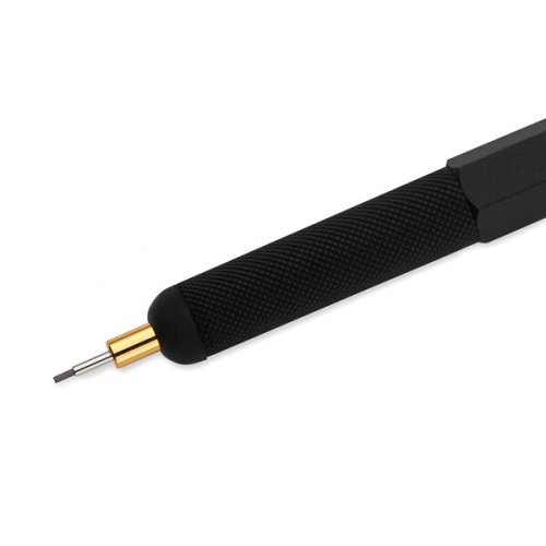 Celokovové šesťboké telo s protišmykovou ryhovanou úchopovou časťou a so zlatými prvkami. Matne čierno lakované mosadzné telo v kombinácii s doplnkami v danej farbe., zatiahnite tuhu a používajte stylus bez nutnosti otáčania mikroceruzky. Mäkká špička stylusu hladko kĺže po povrchu a je kompatibilná so všetkými dotykovými obrazovkami. Vymeniteľný., Mechanická ceruzka (mikrotužka):, * otočný mechanizmus, * tuha HB o hrúbke 0,7 mm, * vstavaná a vymeniteľná gumovacia guma pod krytom viečka, * nastaviteľný indikátor tvrdosti tuhy pre ľahšiu orientáciu pri práci, * vrátane stylusu v úchopovej časti, Dodáva. písací nástroj pre každú príležitosť., TIP: Prečítajte si, aký je rozdiel medzi mikroceruzkami Rotring 500, 600 a 800 >>