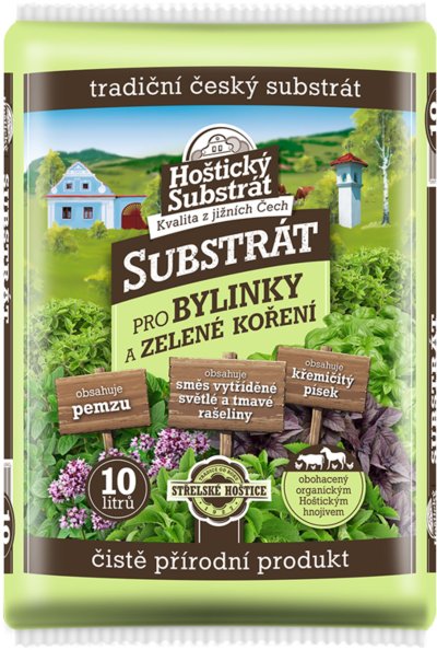 Substrát pre bylinky a zelené korenie je vyrobený zo zmesi vytriedenej svetlej a tmavej rašeliny, pemzy, preosiateho jemne triedeného kremičitého piesku a organických hnojív obsahujúcich všetky hlavné živiny i stopové prvky. Substrát neobsahuje minerálne (priemyselné) hnojivá. Pôdna reakcia je upravená jemne mletým dolomitickým vápencom. Zloženie substrátu podporuje tvorbu silíc a aromatických látok. Je vo forme mikrogranulátu, čo zaručuje oveľa efektívnejšie rozmiestnenie hnojiva v substráte. Vďaka tomu je zaistený rovnomerný rast rastlín a tvorba koreňového systému. Prítomnosť pemzy v substráte má priaznivý vplyv na zadržiavanie vody aj na lepšie prevzdušnenie substrátu. Obsahuje potrebné množstvo základných aj stopových živín. Balenie: 10 l.
