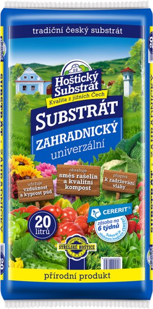 Hoštický záhradnícky substrát je vyrobený zo zmesi svetlej a tmavej rašeliny, kvalitného vytriedeného kompostu a obsahuje minerálne viaczložkové hnojivo CERERIT. Vzhľadom na svoje jedinečné zloženie udržuje kyprost a vzdušnosť pôd a zaručuje tak dobrý rast, bohatú tvorbu koreňov a kvetov u všetkých druhov rastlín. Zadržiavaním slnečných lúčov umožňuje lepšie využitie tepla na rast rastlín, urýchľuje ich zakoreňovanie a prispieva k zadržiavaniu vlahy. Záhradnícky substrát sa používa na sadenie kvetov a zeleniny, výsadbu okrasných i ovocných stromov a kríkov do voľnej pôdy aj do nádob. Obsahuje potrebné množstvo základných aj stopových živín na prvých cca 6 týždňov pestovania. Balenie: 20 l.