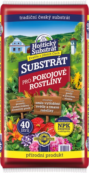 Hoštický substrát pre izbové rastliny je vyrobený zo zmesi vytriedenej svetlej a tmavej rašeliny, preosiateho jemne triedeného kremičitého piesku, perlitu, prírodnej ílovitej zložky a minerálneho viaczložkového hnojiva s mikroprvkami. Pôdna reakcia je upravená jemne mletým dolomitickým vápencom. Substrát je určený na sadenie a presádzanie všetkých druhov izbových rastlín. Má jemnú štruktúru a vďaka perlitu aj vysokú vzdušnosť. Vďaka obsahu ílovitej zložky má vyššiu pútavosť vlahy i živín a zamedzuje ich vyplavovaniu. Obsahuje potrebné množstvo základných aj stopových živín na prvých cca 6 týždňov pestovania. Balenie: 40 l.