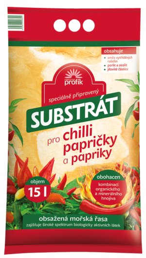 Profík - substrát pre chilli papričky a papriky je vyrobený zo zmesi vytriedenej svetlej a tmavej rašeliny, perlitu, jemne drveného zeolitu a ílovité zložky. Na vyhnojenie substrátu je použitá kombinácia organického i minerálneho hnojiva a zároveň je substrát obohatený o morskú riasu. Organické hnojivo obsahuje všetky hlavné živiny aj stopové prvky. Minerálne hnojivo dodáva rastlinám dusík a vodorozpustný vápnik. Pudná reakcia je upravená jemne mletým dolomitickým vápencom. Výhody substrátu: zloženie substrátu zaisťuje dobrý prístup vzduchu ku koreňom a zároveň aj veľmi dobrú zádržnosť pre vodu a živiny; perlit zaisťuje vysokú vzdušnosť substrátu, substrát vyľahčuje a zároveň reguluje pudnu vlhkosť; jemne drvený zeolit zlepšuje hospodárenie s vodou, napomáha fixácii amónneho dusíka a vďaka vysokej schopnosti pútať živiny obmedzuje možnosť ich strát vyplavovaním; obsah ílovitých častíc napomáha k zadržiavaniu vody, pútania živín i stabilizácii pH; použité organické hnojivo je vo forme mikrogranulátu, čo zaručuje oveľa efektívnejšie rozmiestnenie hnojiva v substráte. Organické hnojivo je vyrobené zo širokej škály vstupných surovín, čím je dosiahnuté rovnomerné a dlhodobé uvoľňovanie živín. Dusík v minerálnej forme je pre rastliny veľmi ľahko prijateľný a vodorozpustný vápnik obsiahnutý v hnojive má významný vplyv na zdravý rast a vývoj rastlín (znižuje výskyt chorôb z nedostatku vápnika, napr. hnilobu na paprikách a iných problémov súvisiacich s nedostatkom vápnika). Morská riasa obsahuje okrem komplexného spektra živín v ľahko prijateľnej forme aj široké spektrum biologicky aktívnych látok vrátane rastlinných hormónov zo skupiny auxinu a cytokininu. Balenie: 15 l.