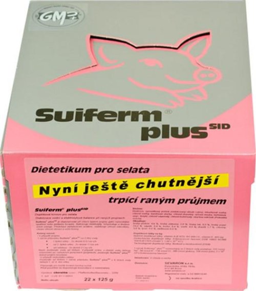 Suiferm plus sa podáva ako samostatné opatrenie alebo ako podpora na terapiu pri všetkých typoch hnačky prasiatok. Jeho včasné podanie znižuje mieru strát úhynom, skracuje dobu trvania hnačky a predchádza strate hmotnosti a zaostávaniu prasiatok. Zloženie: Dextróza, srvátkový prášok (redukovaný obsah cukru), bikarbonát sodný, chlorid sodný, banánové vločky, chlorid draselný, ryžová múka, harmanček, pektín, aníz, fenikel, chlorid vápenatý, chlorid hořečnač. Doplnkové látky: vitamín A 161 000 IU ., vitamín E 400 mg, Enterococcus faecium , bentonit 32.000 mg. Dávkovanie: 1 vrecúško prípravku Suiferm Plus SID sa rozmieša v 2 litroch vody