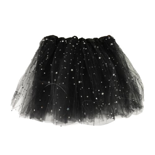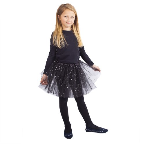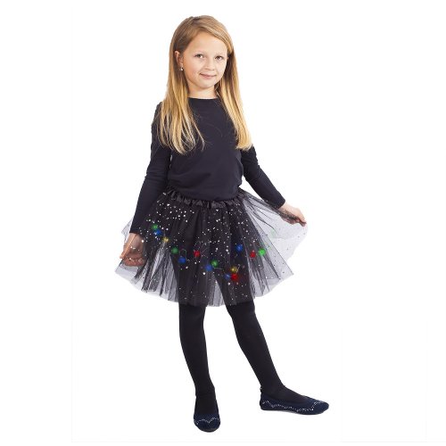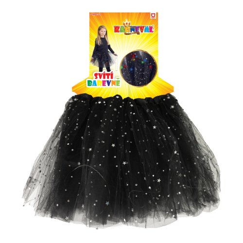 Úchvatná sukňa tutu pre všetky malé parádnice! Sukienka čiernej farby je určená pre dievčatká vo vekovom rozmedzí 3-7 rokov (104-146 cm). Nadýchaná tylová suknička je zdobená saténovou gumou a zdobená flitrami, súčasťou sú farebné svetielka, ktoré po zapnutí svietia. Batérie sú súčasťou. Dĺžka sukne cca 32 cm.