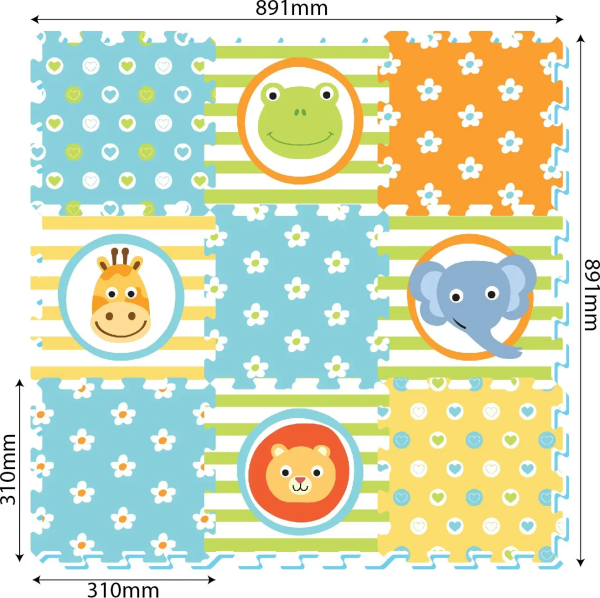 Penové podlahové puzzle s potlačou zvieratiek. Penový koberec je vhodný pre deti už od 10 mesiacov. Je ideálny na vytvorenie hracej plochy nielen do detských izbičiek, ale všade tam, kde sa hrajú deti a plávajúca podlaha, dlažba alebo linoleum sú príliš chladné. Penové podlahové puzzle je mäkké, umývateľné, zdravotne nezávadné, tlmí hluk a skvele izoluje. Hrúbka dielikov je 1 cm.