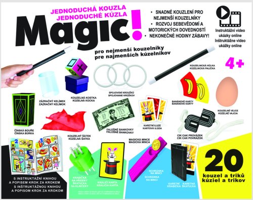 SUPER ľahká mágia, sada 20 trikov S touto prepychovou zbierkou kúzelných rekvizít a pomocou niektorých predmetov každodennej potreby budete môcť vykonávať 20 neuveriteľných kúziel, trikov a ilúzií. Obsahuje najjasnejšie pokyny krok za krokom a aj tí najmladší kúzelníci môžu čoskoro rozvinúť svoje zručnosti. Staňte sa majstrami a umelcami ‚mágia'! Vek 4+, obrázkový návod + on line návod