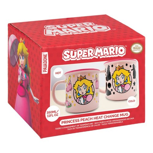 Meniaci hrnček s motívom princeznej Peach v objeme 350 ml. Hrnček nie je vhodný do umývačky riadu a mikrovlnnej rúry.