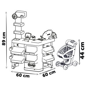 Supermarket s pokladňou, oddelením ovocia/zelenina, váhou (nová mechanická váha: zobrazená hmotnosť sa upravuje podľa vážených potravín). Dieťa môže nastavovať hodiny a panel otvorené/zatvorené. Obsahuje 42 doplnkov: cestoviny, sušienky, cereálie, mlieko, 6 kusov ovocia a zeleniny, 1 koláč, 2 makrónky, 2 plechovky, 1 elektronický snímač čiarových kódov so zvukom a svetlom, 1 kreditná karta, 4 účtenky, 9 mincí a 12 bankoviek. Pokladňa má zásuvku na peniaze, mikrofón a čítačku kreditných kariet. Vozík súčasťou.