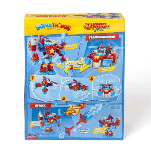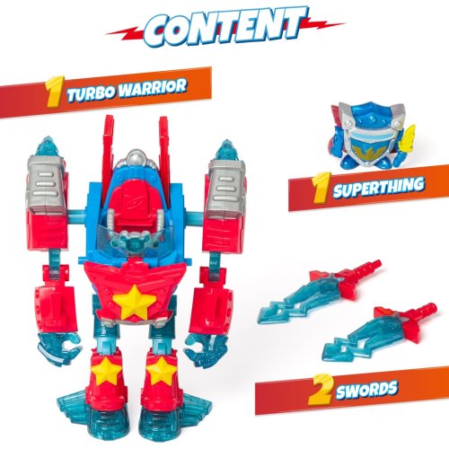 Turbo Warriors dorazili do Kaboom City! Zoznámte sa s Turbo Power a jeho rivalom Turbo Speed – robotmi novej generácie, ktorí sa premieňajú na vozidlá! Každý z nich má svoju špeciálnu zbraň pre divoké bitky, a keď príde správny čas, premení sa na auto a motorku plnej kazoom sily! Aj keď sú ich vodiči exkluzívni SuperThings, obaja sú kompatibilní so SuperThings aj Kids, takže zábava nikdy nekončí! Obsah balenia: • 1 Turbo Warrior • 1 exkluzívny doplnok • 1 exkluzívny SuperThing