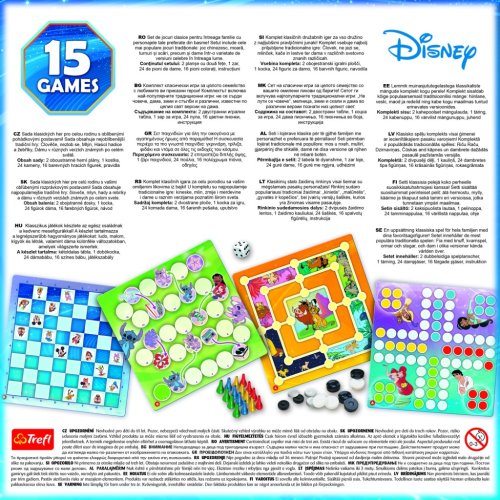 Súprava klasických hier pre celú rodinu s vašimi obľúbenými rozprávkovými postavami Disney. Sada obsahuje najpopulárnejšie tradičné hry: človeče, mlyn, hady a rebríky a dámu v rôznych verziách známych po celom svete.