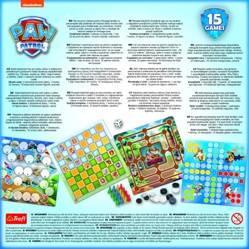 Set klasických hier pre celú rodinu s obľúbenými rozprávkovými postavami Tlapková patrola. Sada obsahuje tradičné hry: Človeče, nehnevaj sa!, Mlyn Hady a rebríky, Dámu a ďalšie hry poznáme po celom svete. Obsah balenia: obojstranné herné plány, 1 kocka, 24 kameňov, 16 farebných hracích figúrok, pravidlá. Pre 2 – 4 hráčov. Rozmery balenia: 24 x 24 x 6 cm. Vhodné pre deti od 5 rokov.